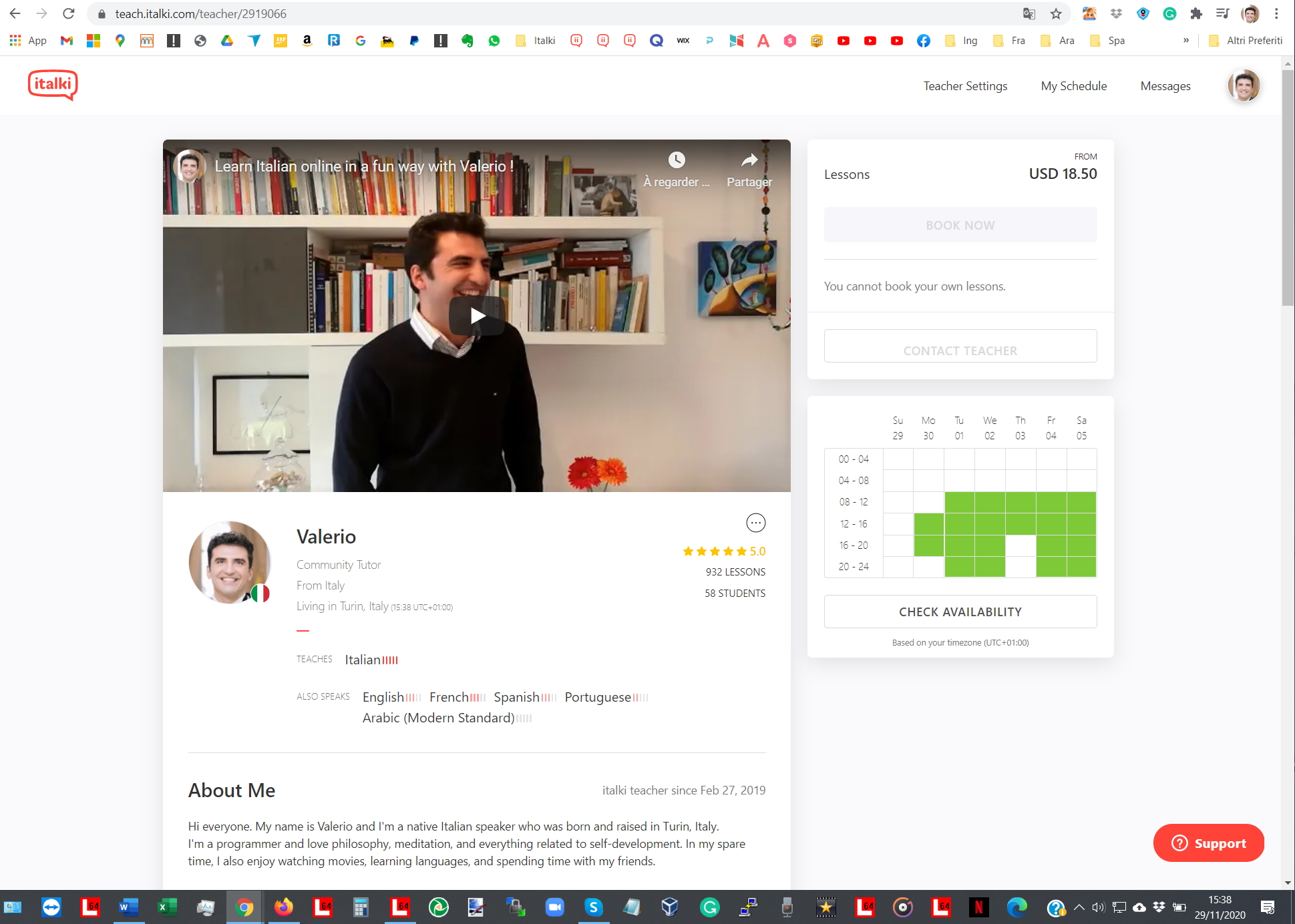 Hola a todos, mi nombre es Valerio y soy un hablante nativo de italiano que nació y creció en Turín, Italia. Amo la filosofía, la meditación y todo lo relacionado con el autodesarrollo. En mi tiempo libre, también disfruto viendo películas, aprendiendo idiomas y pasando tiempo con mis amigos.