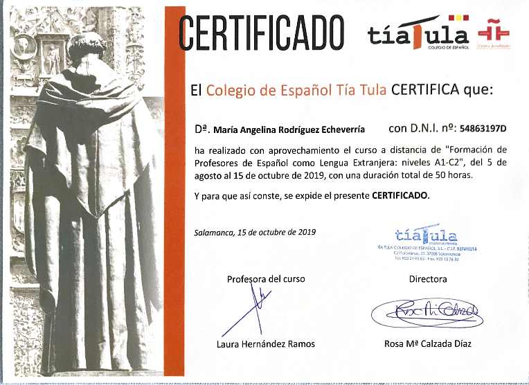 - Profesora certificada de los niveles de español A1/A2, B1/B2 avalado por el Instituto Cervantes 2019.