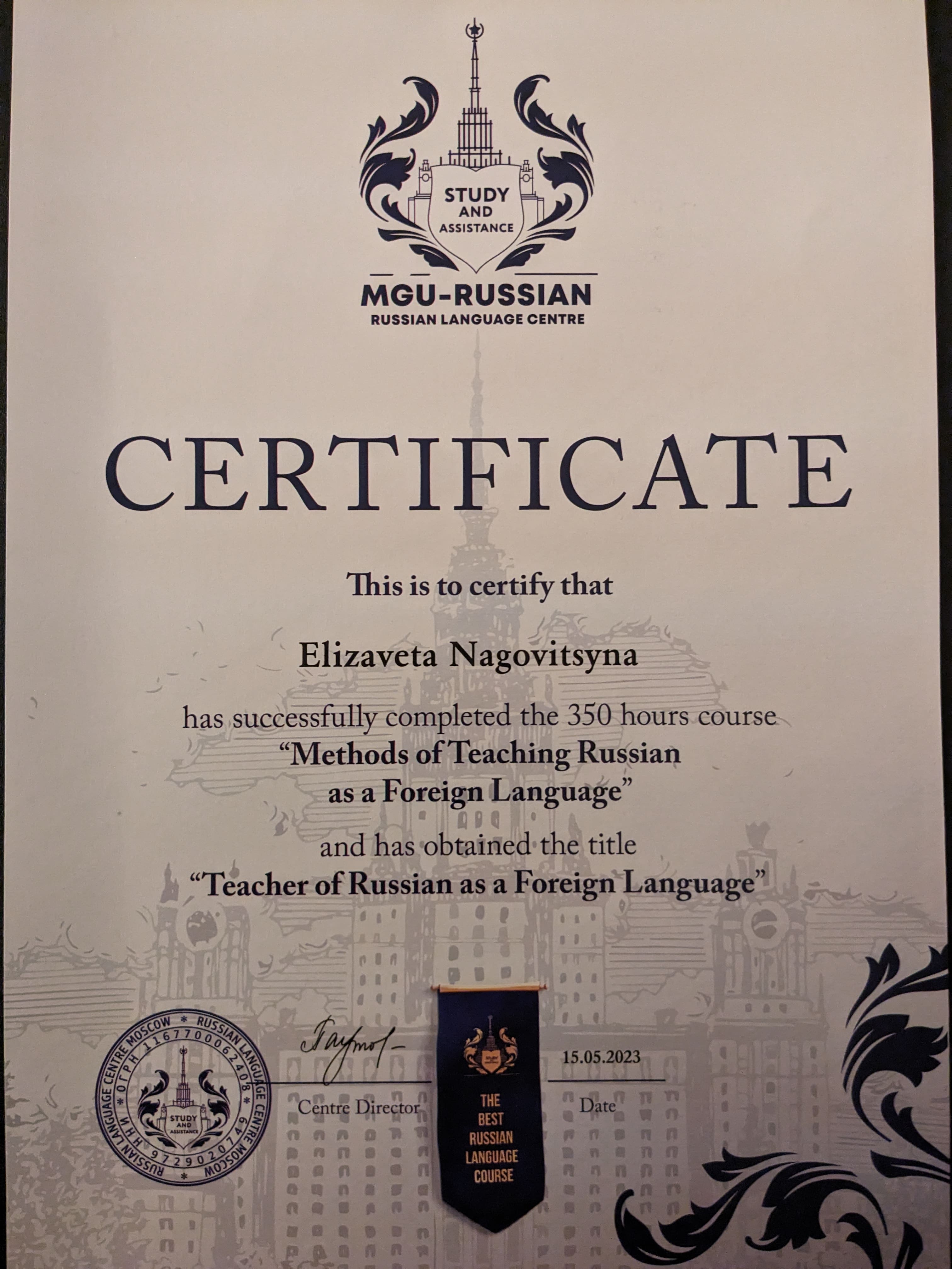 Professeure du russe certifiée, je suis également titulaire d'un diplôme de Licence en lettres obtenu en Russie et d'un diplôme de Master en Linguistique et Traduction obtenu en France.