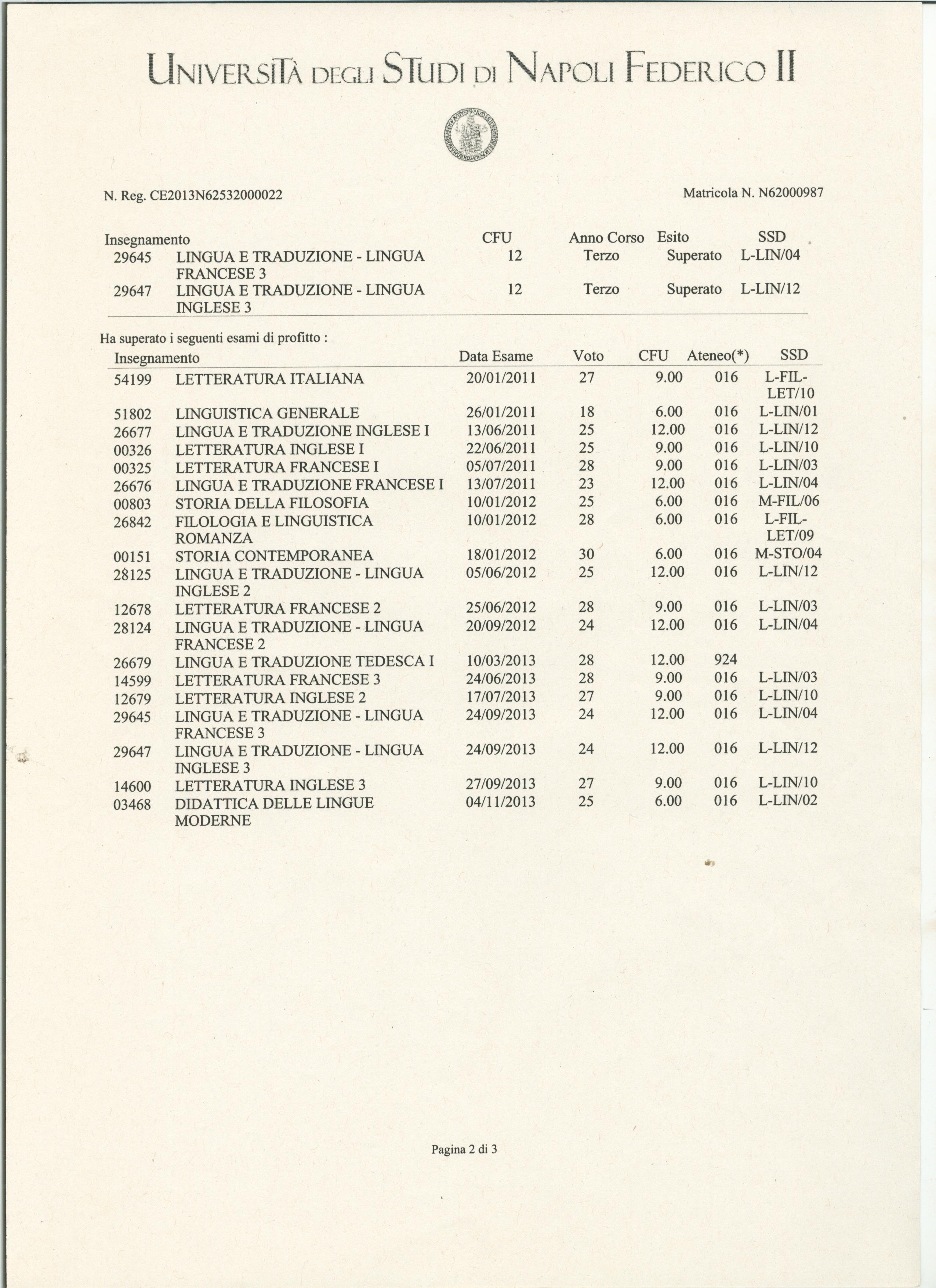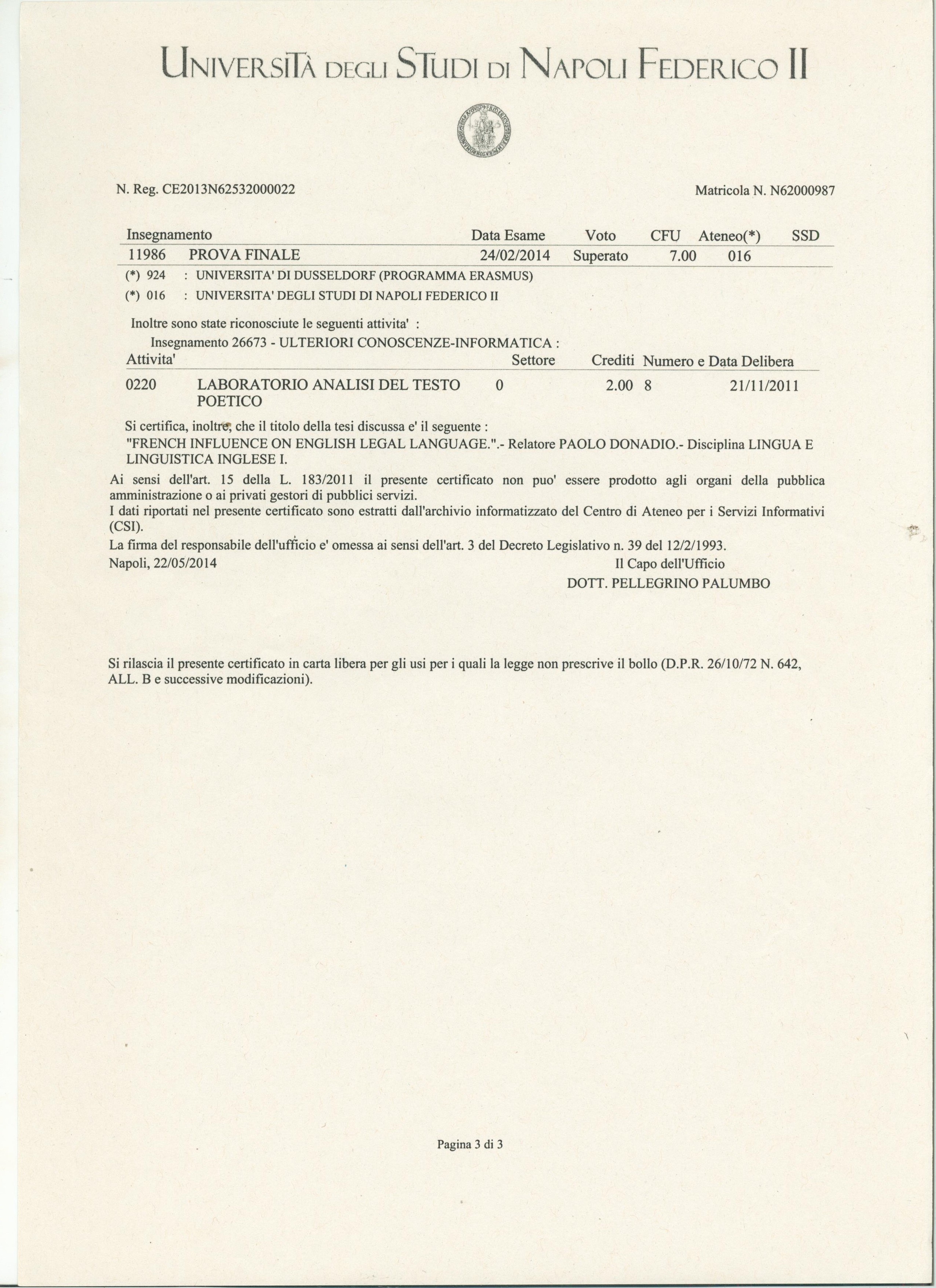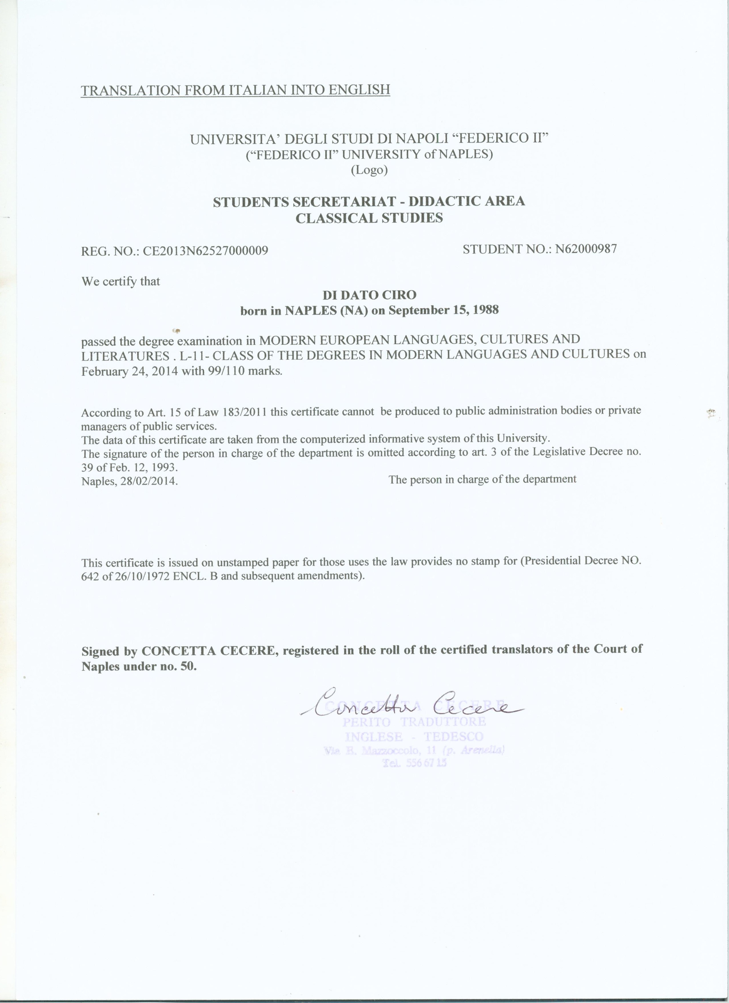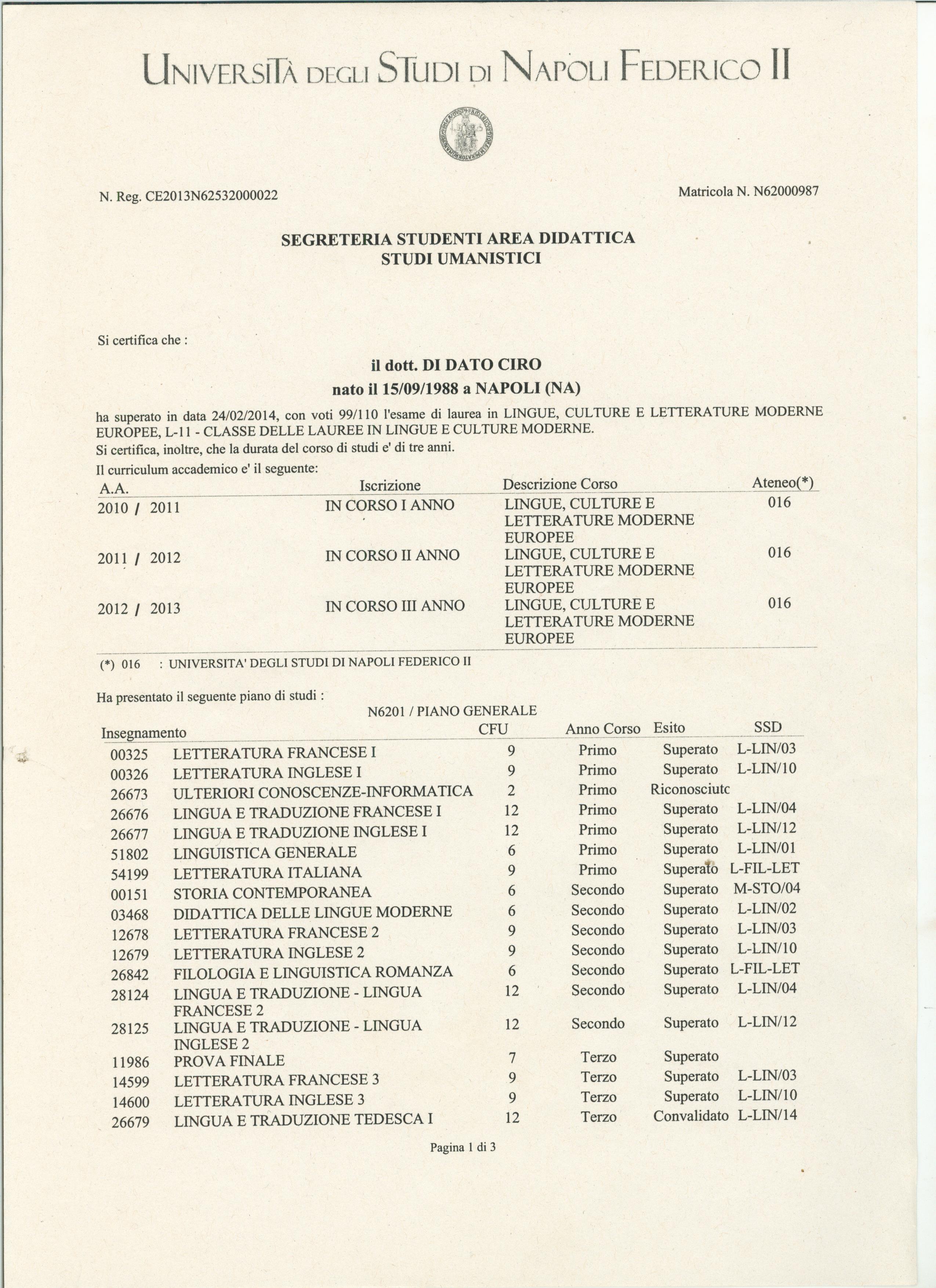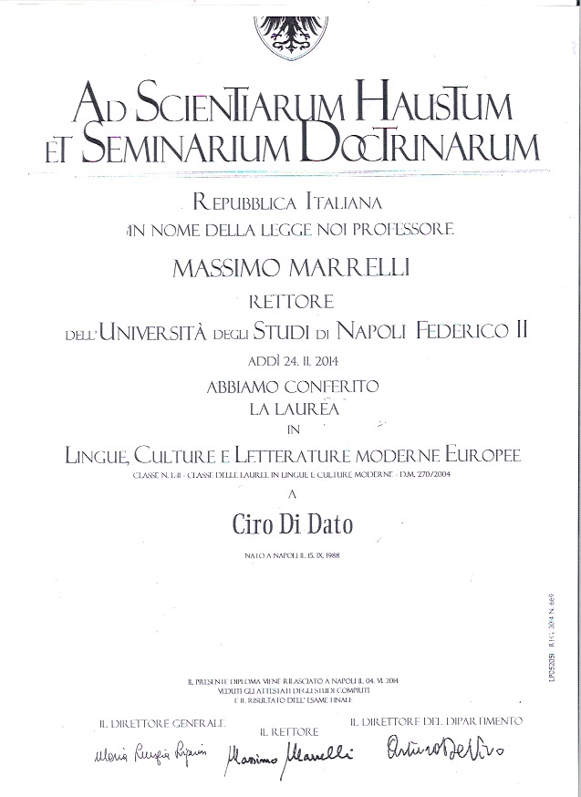 Mi sono laureato in Lingue Culture e Letterature Moderne Europee all'Università Federico II di Napoli e ho eseguito un master in Linguistica Inglese all'Heinrich-Heine Universität di Düsseldorf.