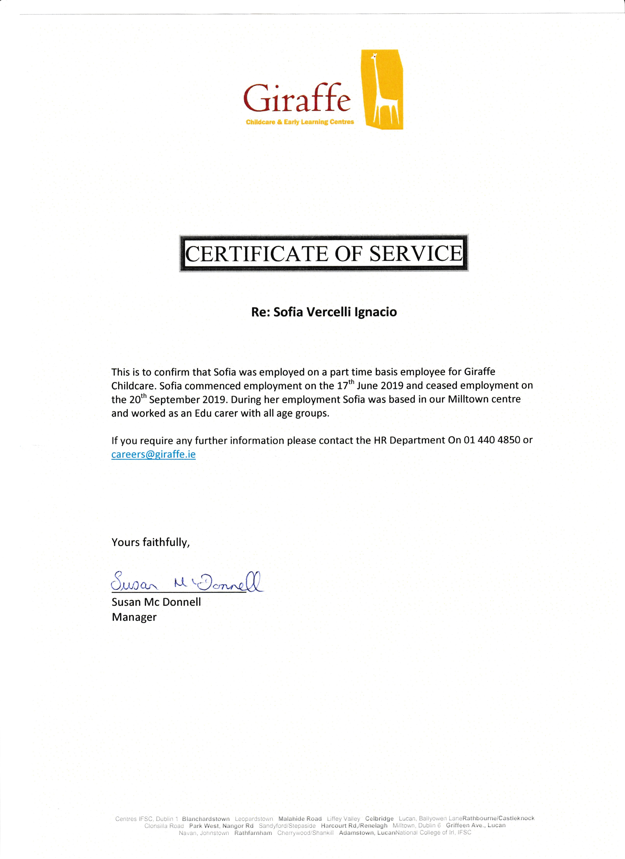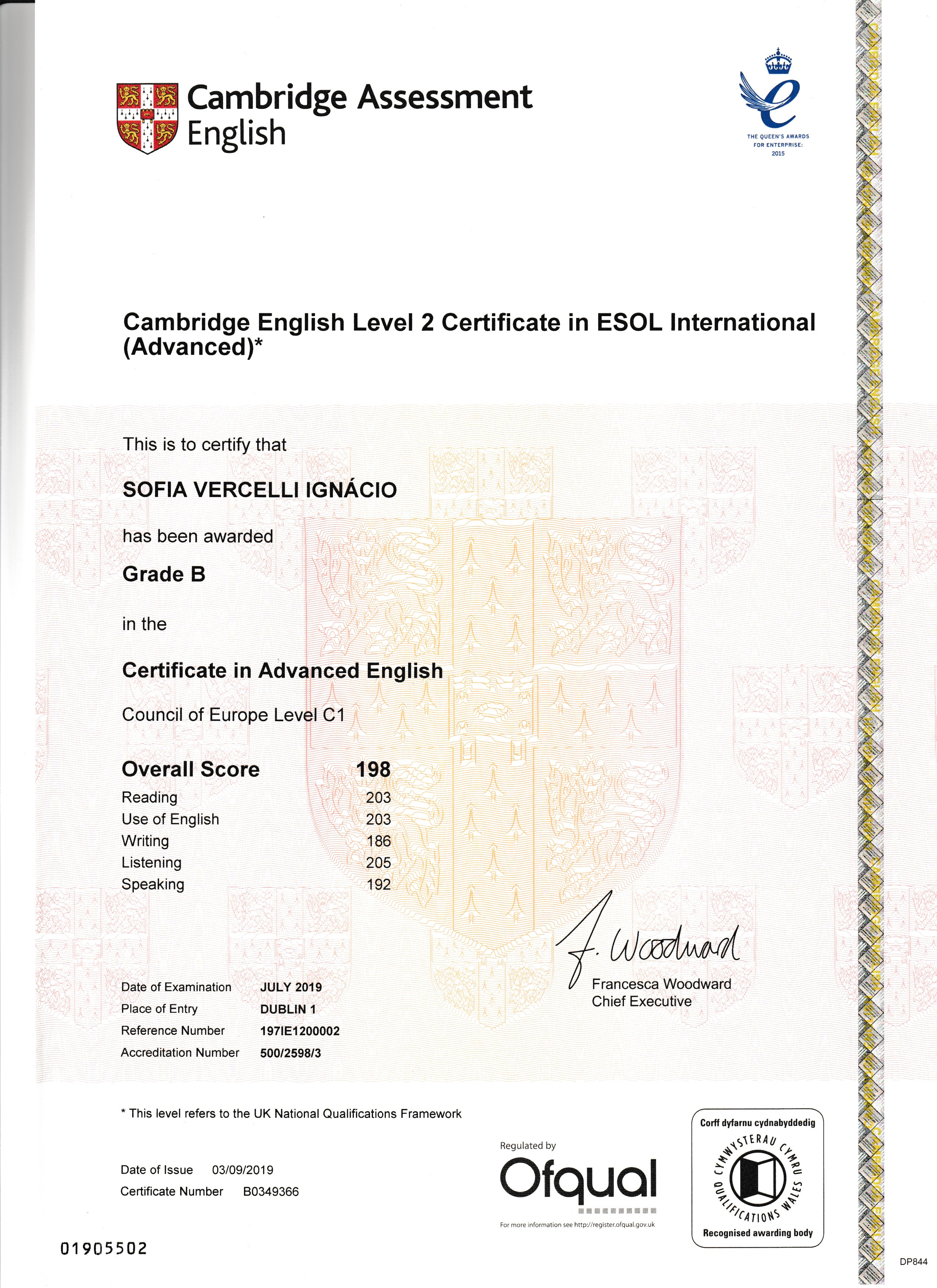 Nel 2019 ho studiato inglese e ho lavorato come insegnante in Irlanda, dove ho ottenuto il certificato Cambridge: C1 Advanced.