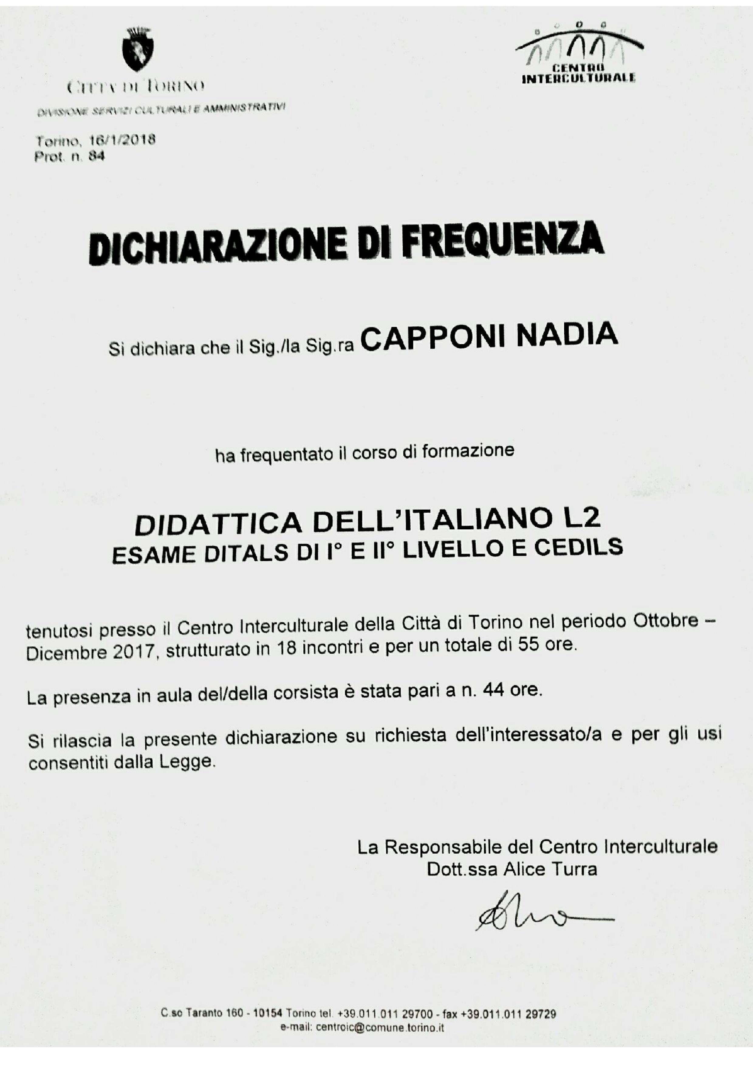 Nel 2017 ho iniziato a dare lezioni di italiano e di russo; ho inoltre frequentato, presso il Centro Interculturale di Torino, il corso di Didattica dell'italiano per stranieri, propedeutico alla certificazione DITALS, e ho svolto 40 ore di tirocinio come insegnante di italiano presso il CPIA 2 di Torino.