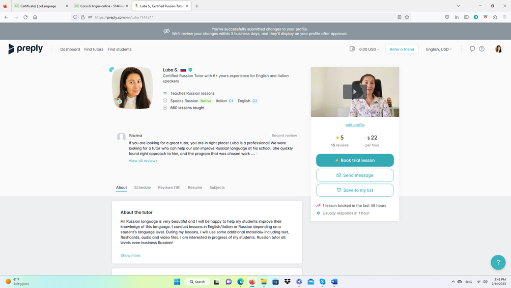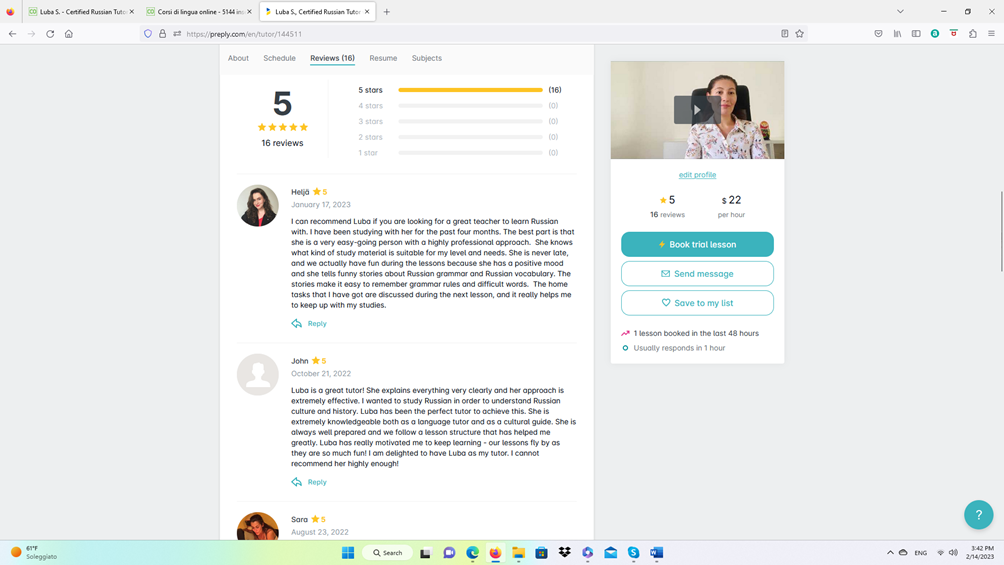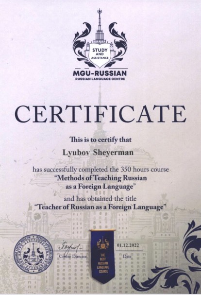 La lingua russa è molto bella e sarò felice di aiutare i miei studenti a migliorare la loro conoscenza di questa lingua. Offro aiuto per la preparazione ad esami, concorsi diplomatici, altresì lezioni di conversazione, russo per il lavoro, russo per viaggi. Ho molta esperienza con i bambini bilingui.
