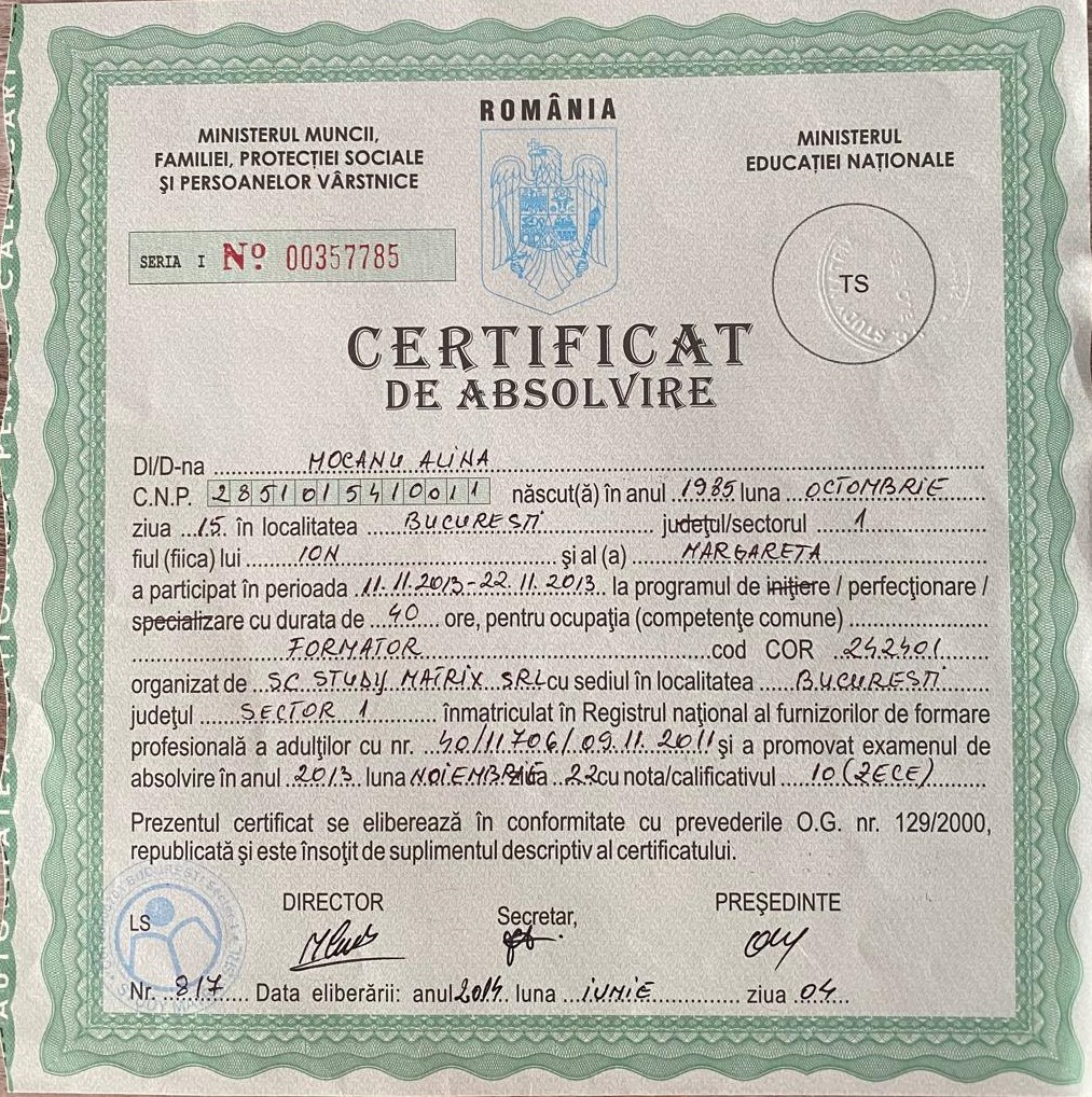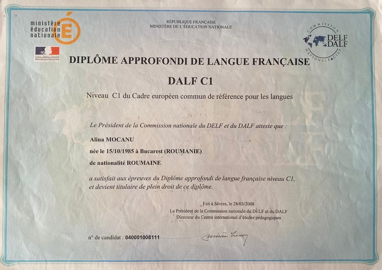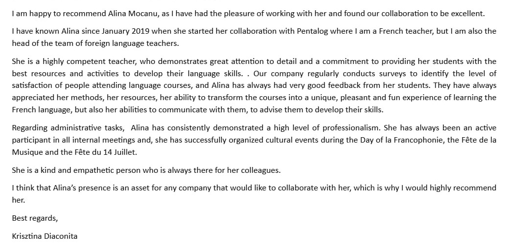 - Delivering courses of Romanian, French and English as a foreign language, general and business language, all the levels (A1 – C2), to private individuals (teenagers and adults) and employees (companies such as RENAULT, EXPLEO, ACCENTURE, ORANGE, ALSTOM, MICHELIN, EUROMASTER, ROMPETROL, AS24, PLAYWING, AMA XPERTEYE, AXWAY, LUXOFT, PENTALOG, VEO WORLDWIDE SERVICES), one to one and in groups, in person and online (via Skype, Teams, Zoom or Google Meet)