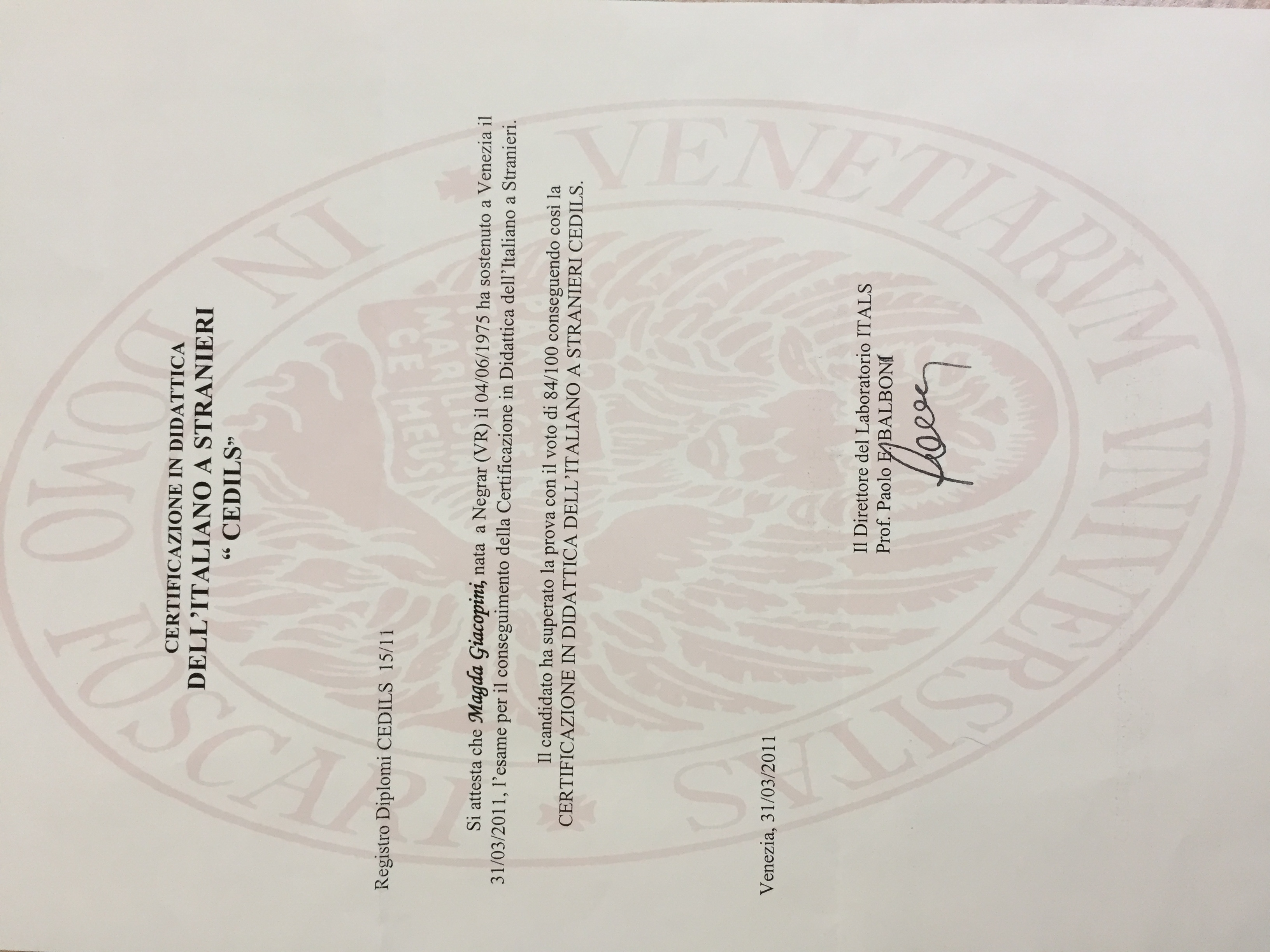 Na het behalen van het certificaat Cedils (certificaat van bekwaamheid in het lesgeven van Italiaans aan buitenlandse studenten), verstrekt door de Università Ca' Foscari Venezia, heb ik 4 jaar ervaring opgedaan in het geven van Italiaanse lessen aan Nederlanders. Dit werk heb ik altijd met veel plezier gedaan, het betrof zowel beginners als gevorderden.