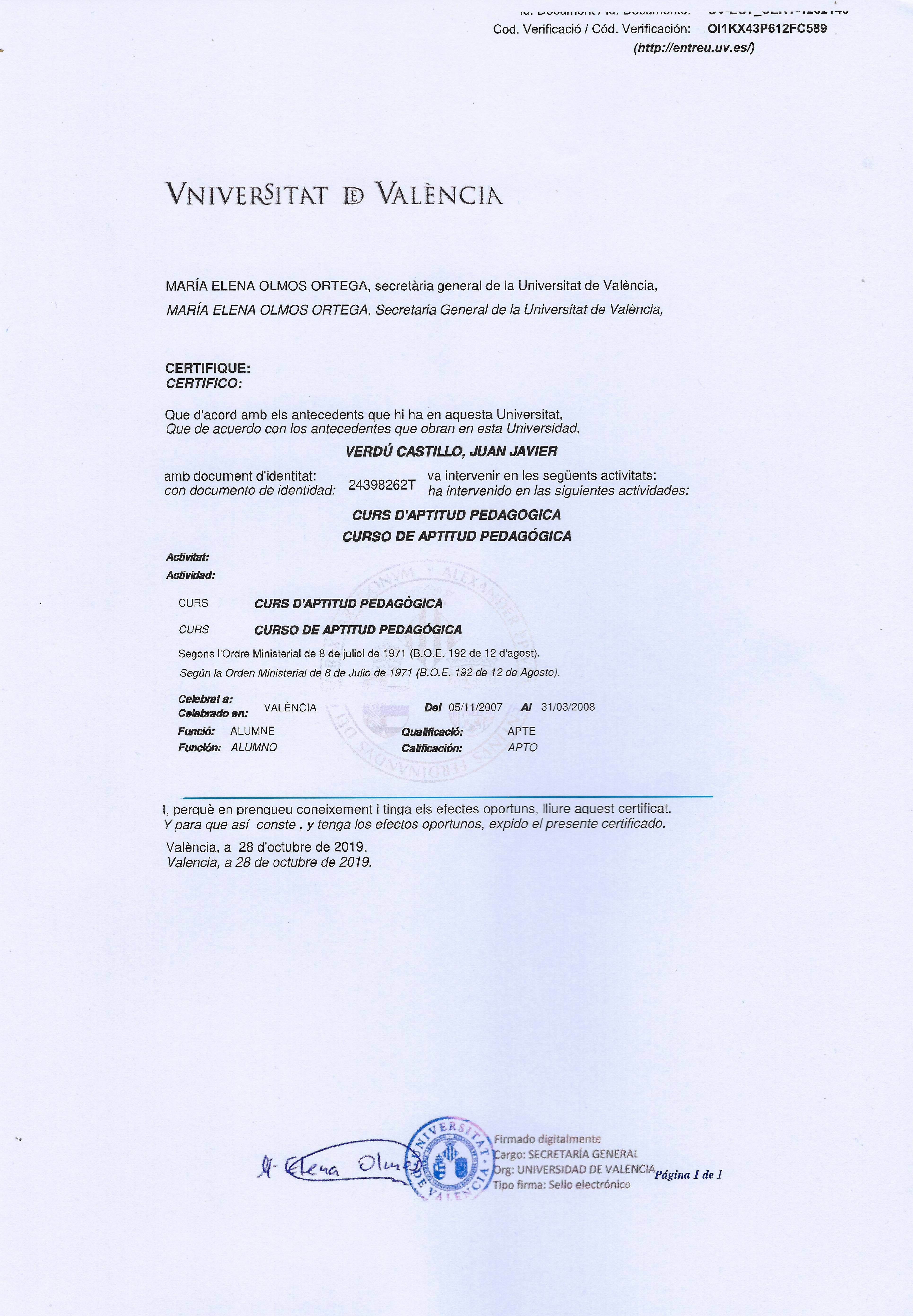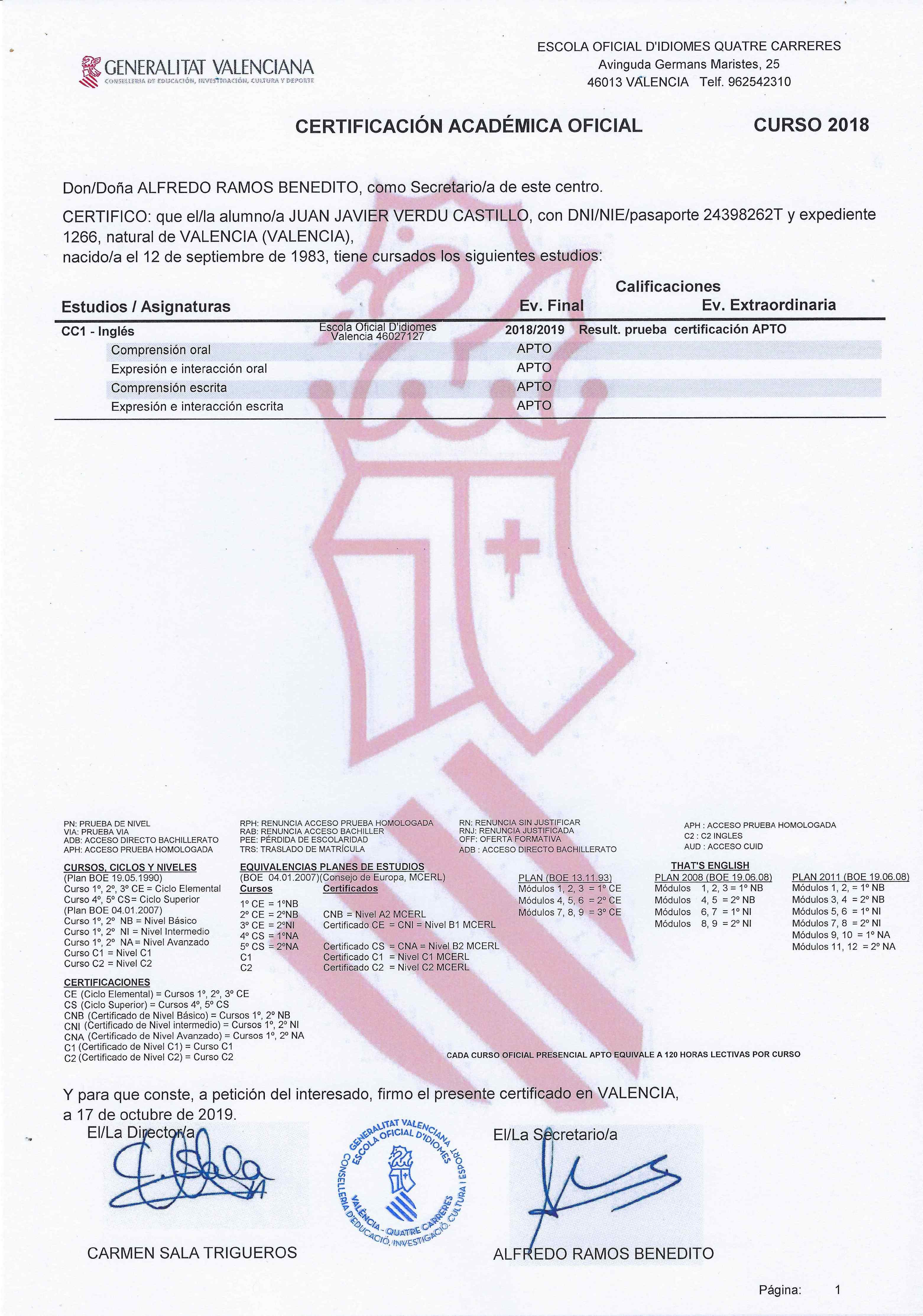 Impartición de clases de valenciano (3º-4º ESO y 1º-2º de Bachillerato) y de inglés (1º-2º-3º ESO) a jornada completa. Tutoría de 2º de Bachillerato. Experiencia con Alexia y Bachillerato Dual.