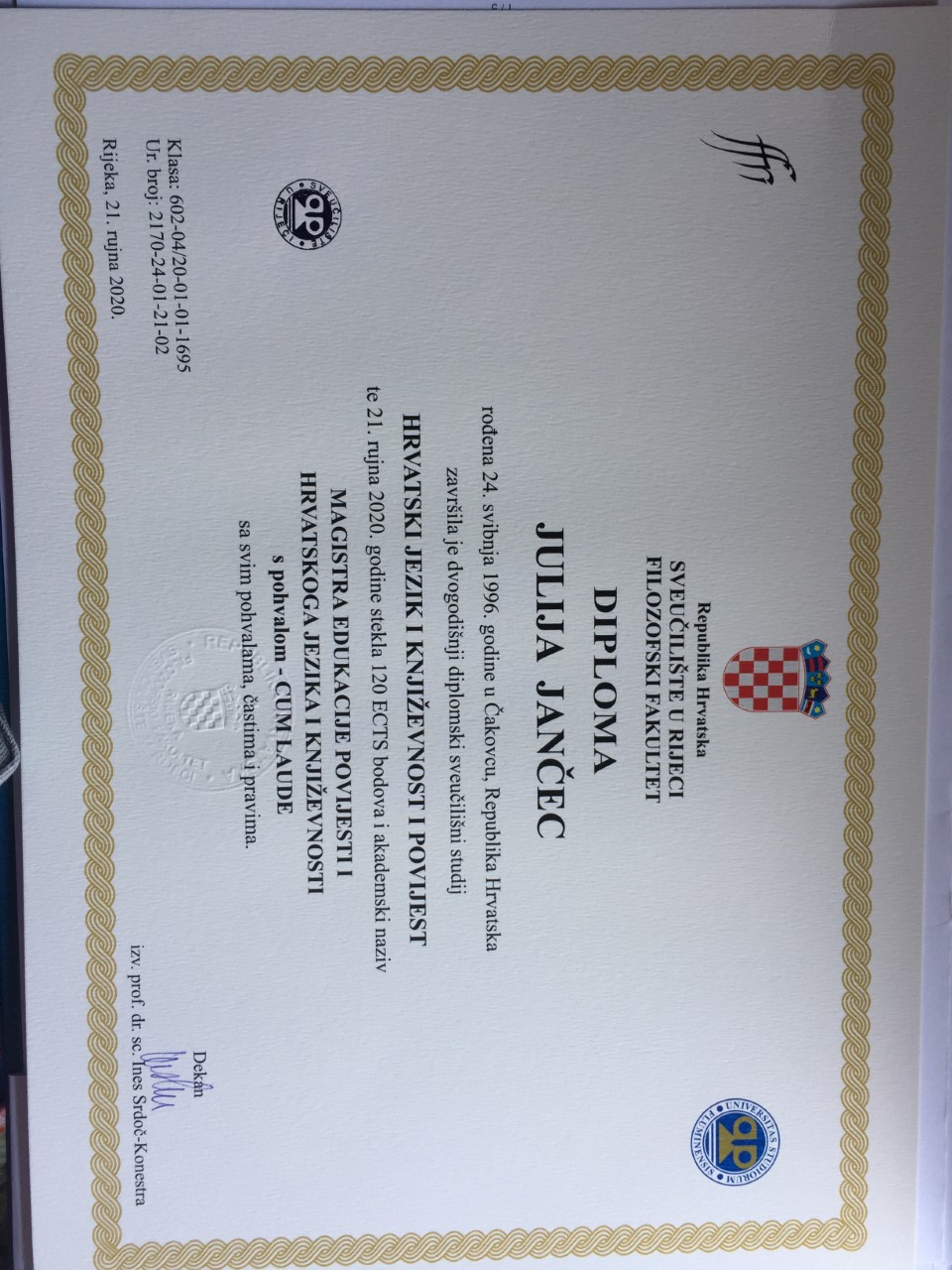 Complished MA degree in Croatian language and literature and History in 2021. Teaching Croatian language in high schools.