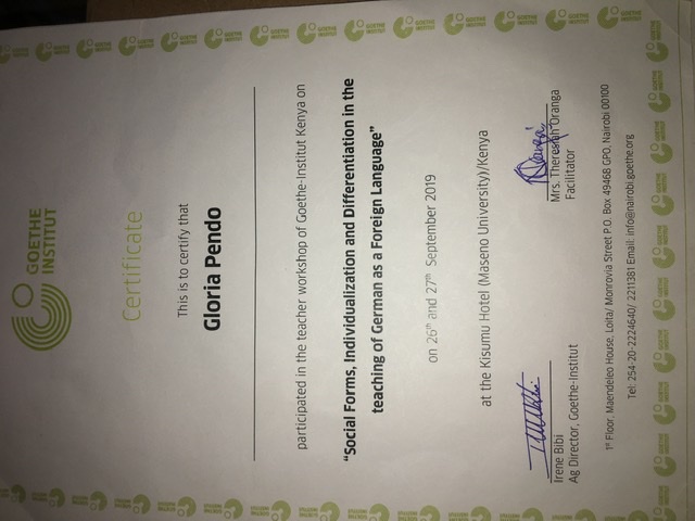I am a professional after undertaking training through Goethe institute as a teacher ,,through that I have been able to acquire adequate teaching methods ,,example single task, partner task,group works and class work ,,I use books, out door learning,,boards , I also use day to day ethics to teach ,,I use what is in our environment to learn effectively