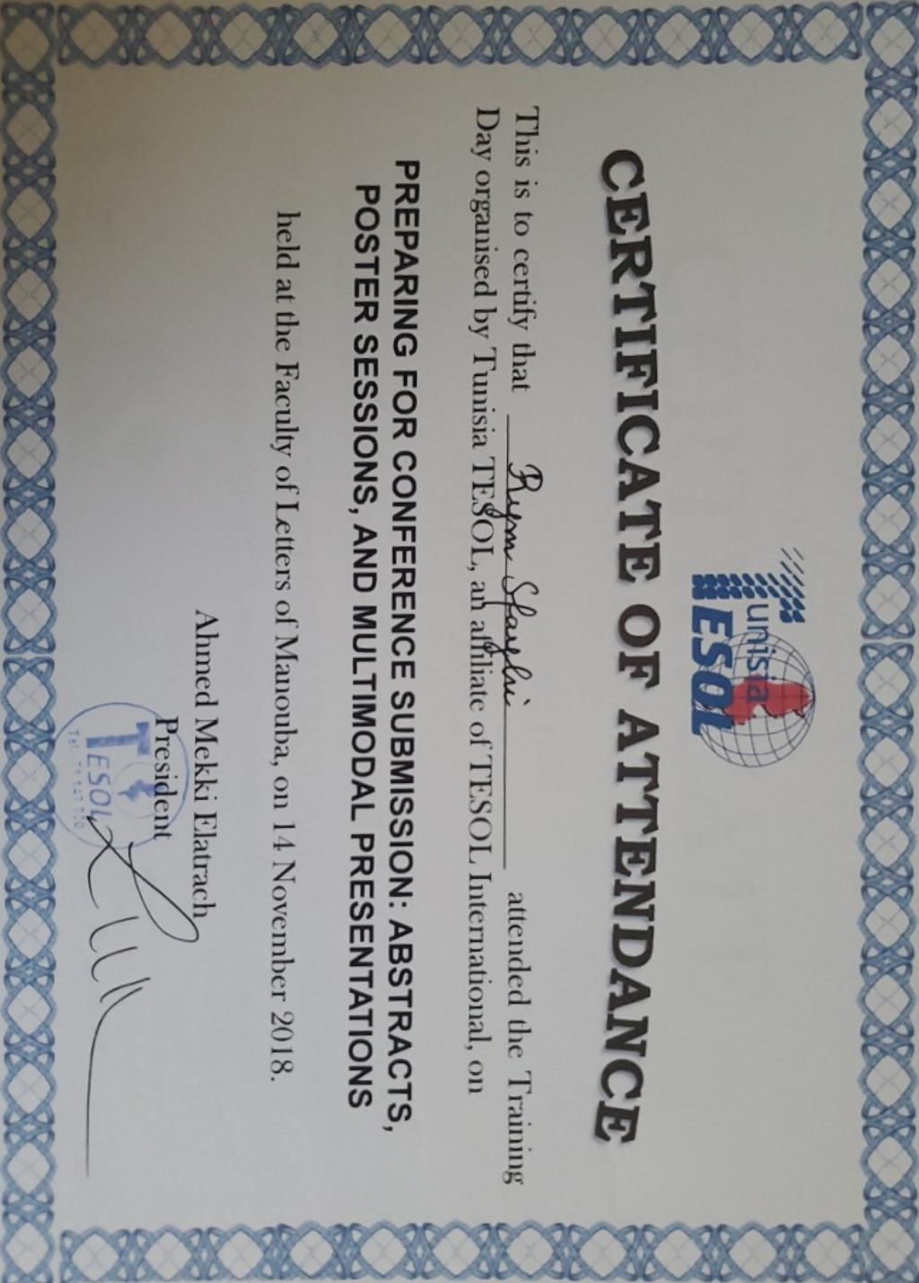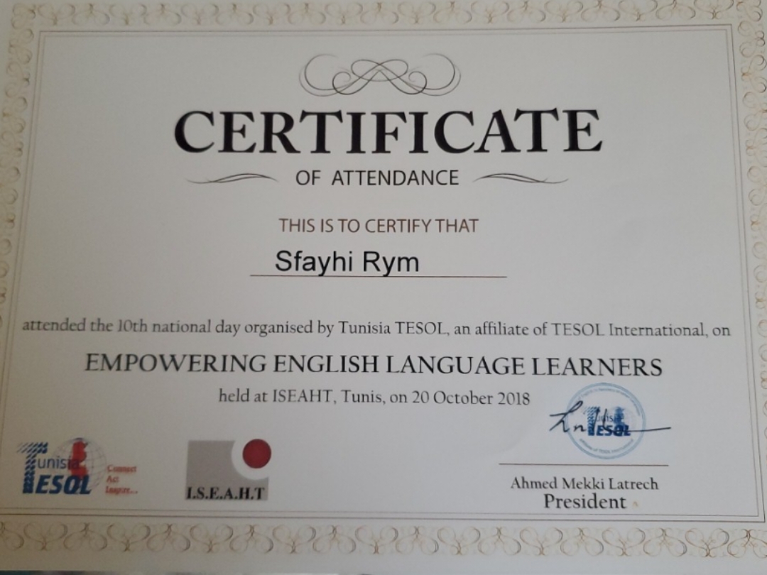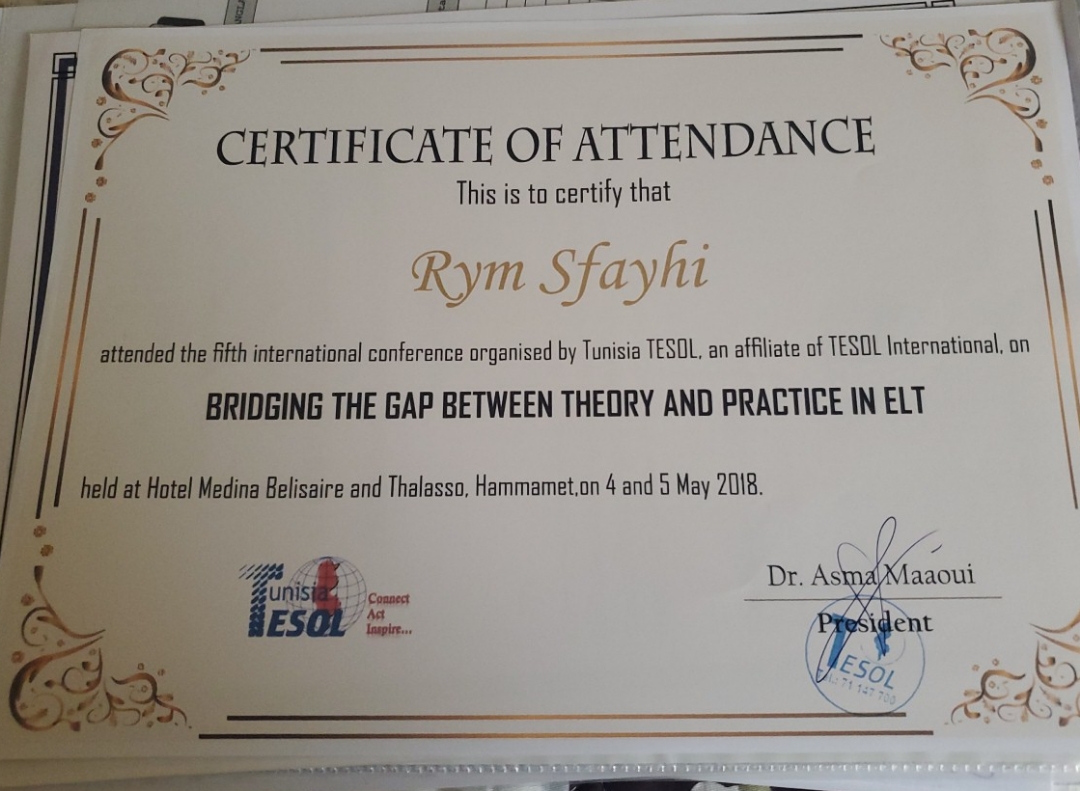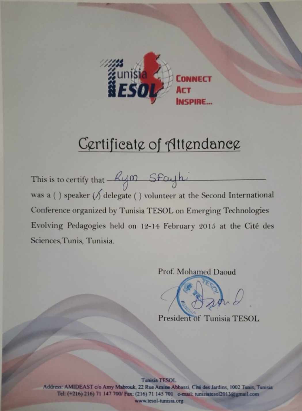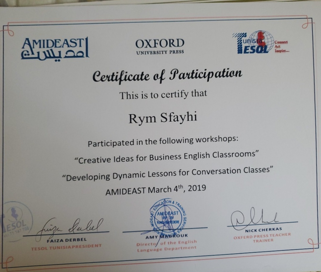 I attended many workshops with Amideast Tunisia and British council Tunisia. I am also a TESOL member and I do really want to engage in presentations infront of audience when being in a conference. I usually present motivating theme that are related to language learning.
