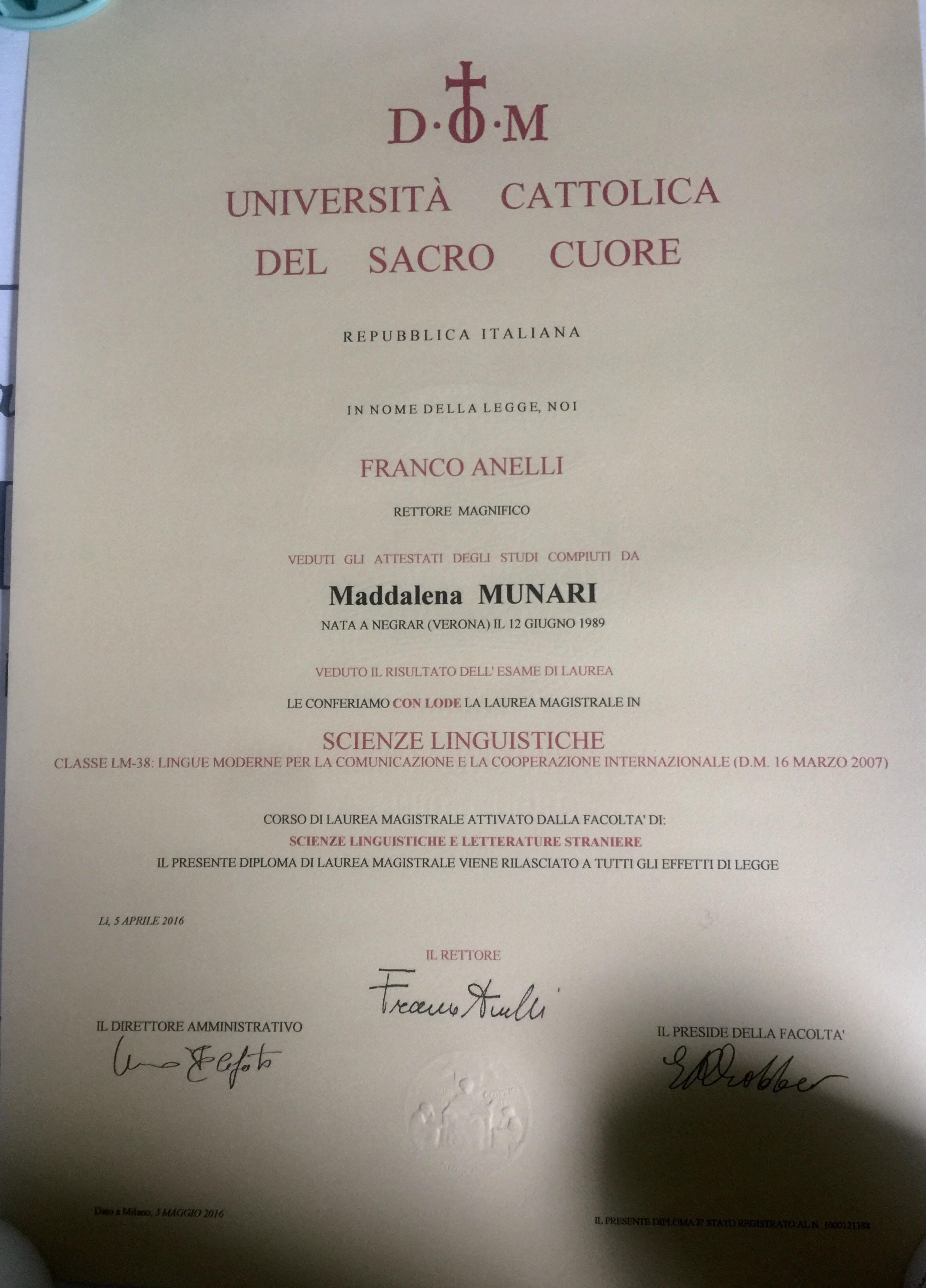 I have a Bachelor’s degree in Languages and Literature from the University of Verona (Italy) and a Master’s Degree, cum Laude, in Languages and Media from the University ‘Cattolica’ in Milan (Italy) and Chapman University in Orange, California (USA).