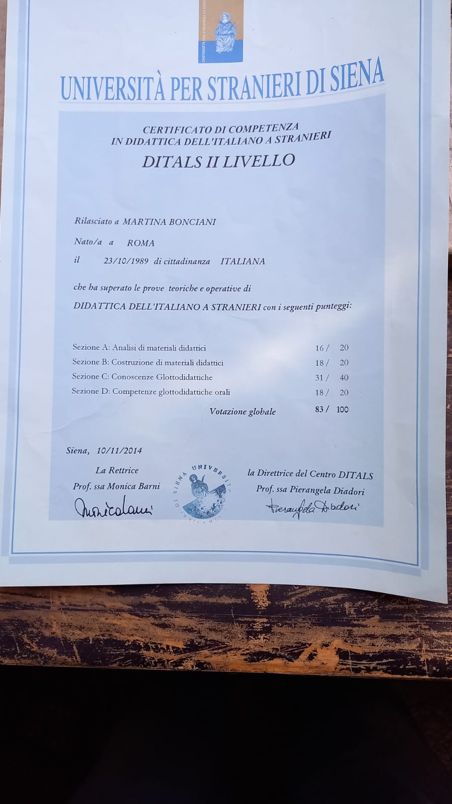 I offer lessons of language, grammar and conversation. I attended a course to teach Italian as L2, that required also a stage of 150 hours of teaching to a class. I obtained the DITALS II certificate, released by the University of Siena, that testifies my teaching abilities. I have experience in offering private lessons too.